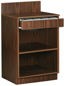 Units constructed of black or walnut finish laminated melamine with 3mm thick PVC edging, matching interior adjustable shelves, and matching 1/4" melamine cabinet back. Drawer features roller bearing self closing slide tracks.