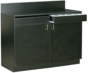 Units constructed of black or walnut finish laminated melamine with 3mm thick PVC edging, matching interior adjustable shelves, and matching 1/4" melamine cabinet back. Doors feature european hinges, and drawers feature roller bearing self closing slide tracks.