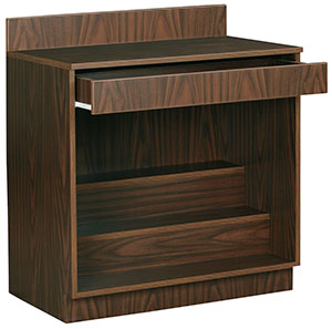Units constructed of walnut finish laminated melamine with 3mm thick PVC edging, and matching 1/4" melamine cabinet back. Drawer features roller bearing self closing slide tracks.